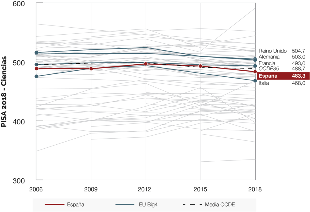 España, con una puntuación de 483,25 en PISA 2018, presenta los peores resultados en el ámbito desde que se empezó a evaluar este ámbito (2006), aunque con variaciones interanuales muy reducidas. Apenas 13 puntos separan la máxima puntuación obtenida por España (PISA 2012) y la mínima de este año.